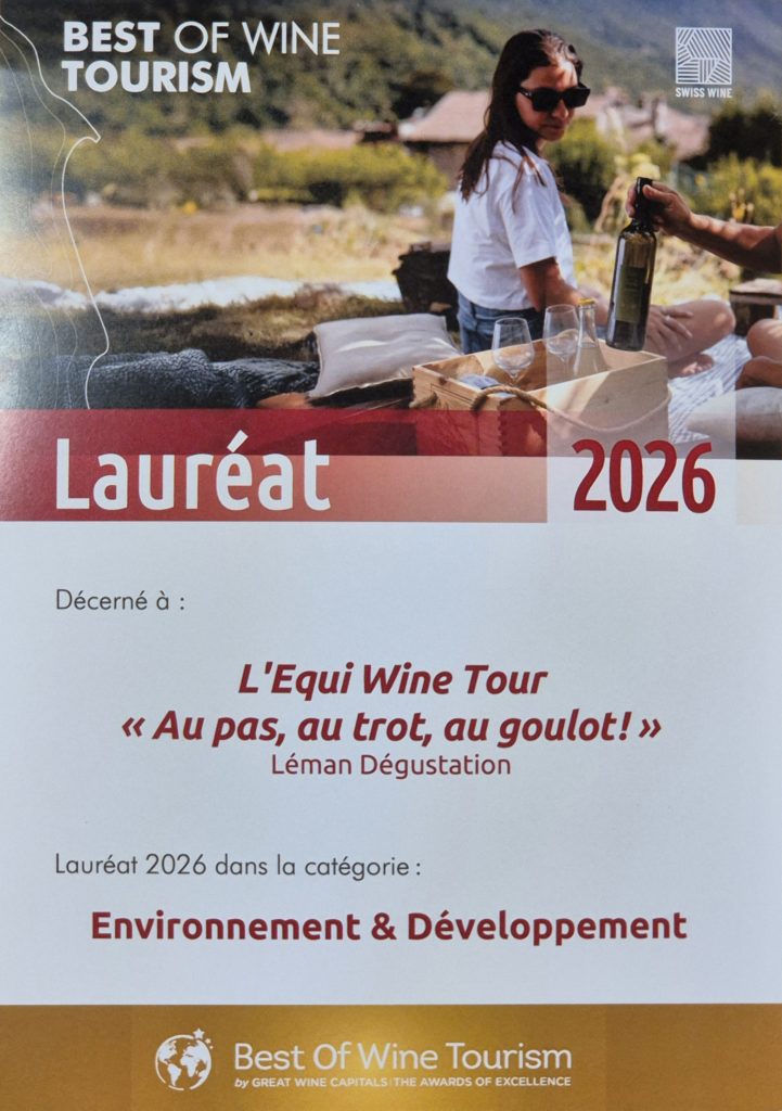 septembre 2025 : Quelle chance de rentrer de Lausanne avec le pris de lauréat dans la catégorie Sustainable wine tourism. Un merci tout particulier à mon ami « Zen » des Atelages du Léman avec qui je travaille depuis 6 ans.